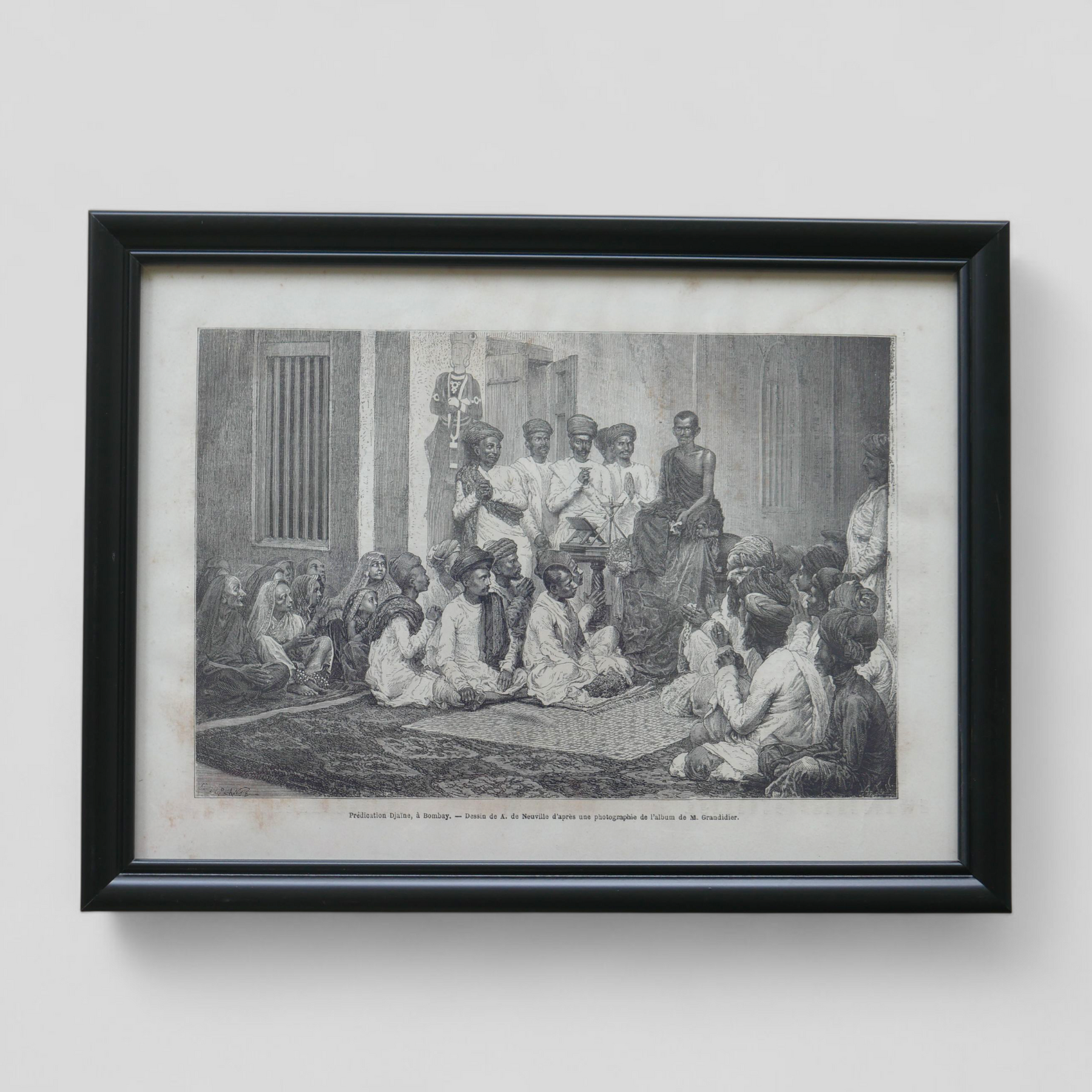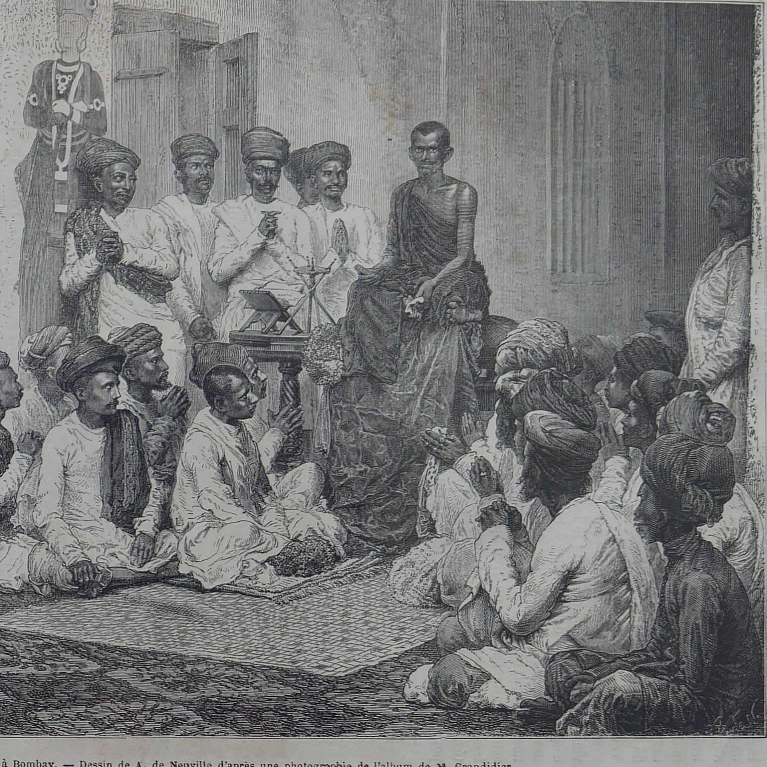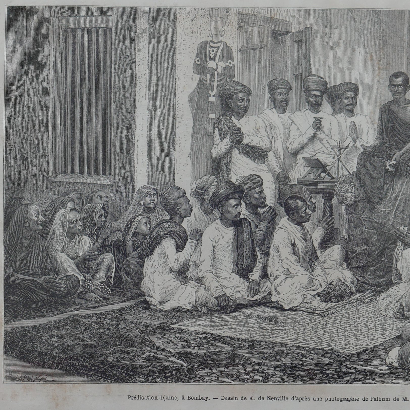 A finely detailed woodcut engraving depicting a Jain religious gathering in Bombay (now Mumbai), published in The Illustrated London News in 1875 and attributed to the French engraver Charles Laplante (1837–1903). Known for his intricate line work and contributions to leading 19th-century illustrated periodicals, Laplante captured scenes of global life for a European audience.