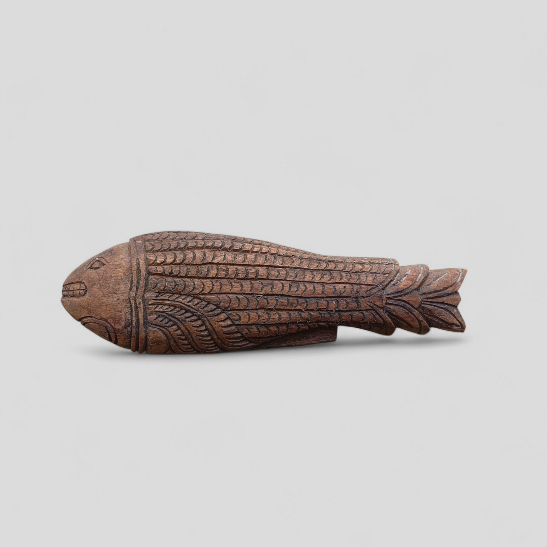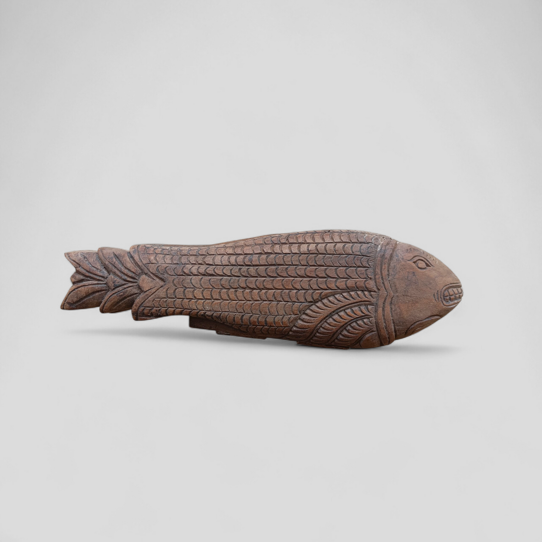 The fish motif carries symbolic meaning in Indian visual culture, associated with fertility, prosperity, and auspicious beginnings. In many South Indian households, wooden game boards such as these were preserved as heirloom objects and passed down across generations.