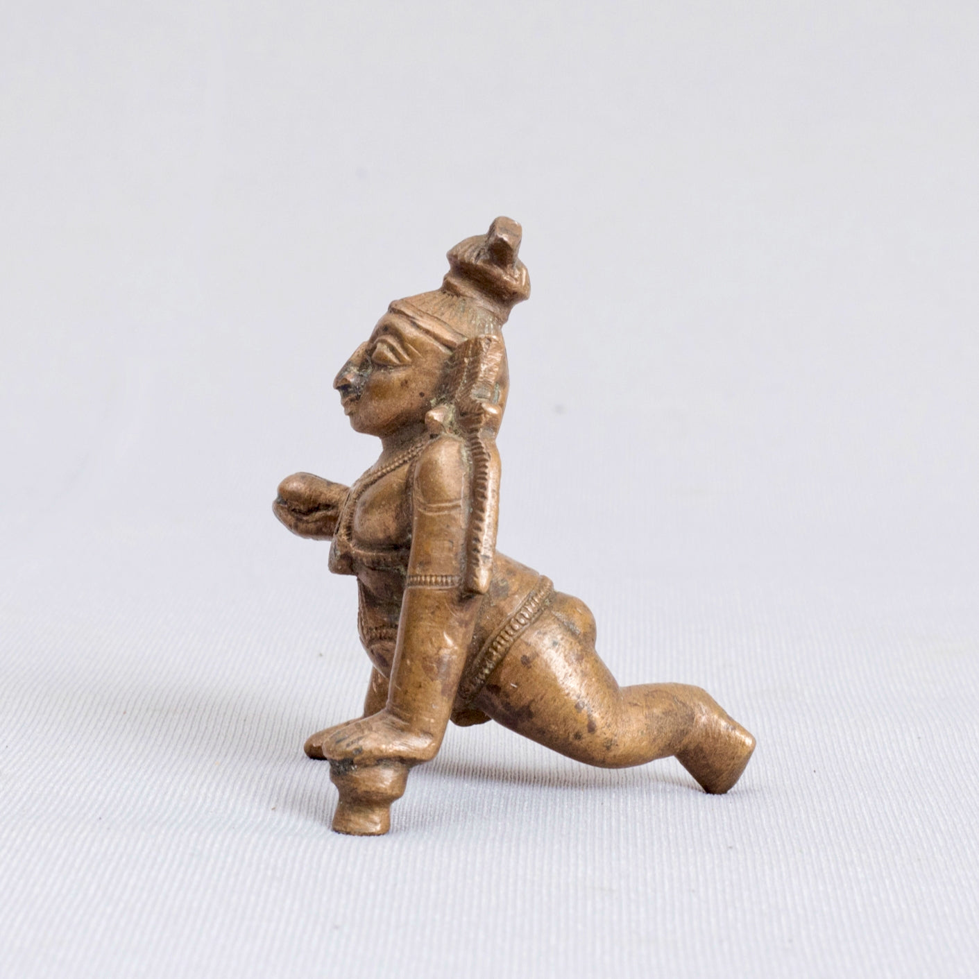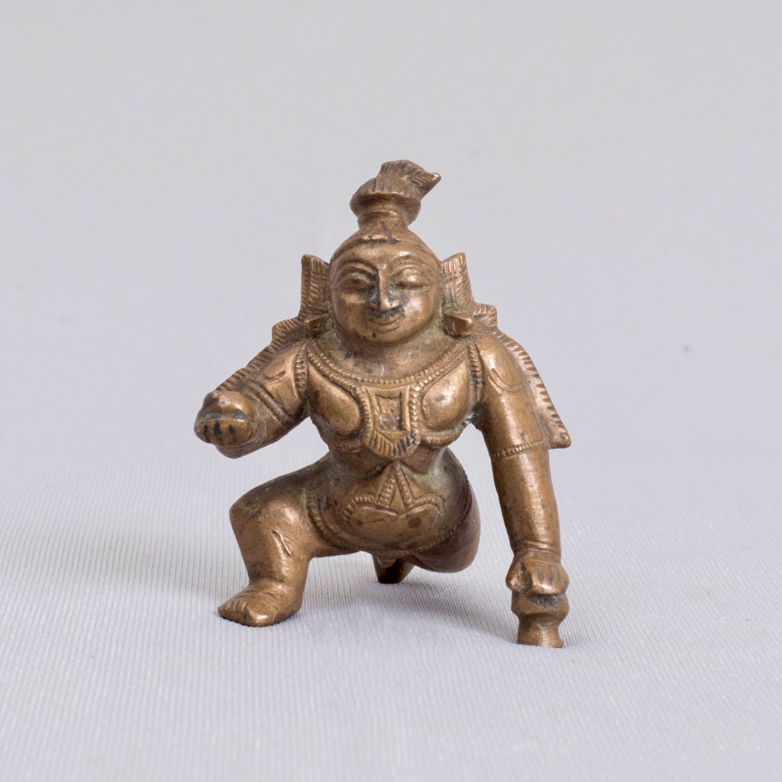This vintage bronze figure of Balagopala (Child Krishna) depicts the deity in a crawling posture, holding a ball of butter in his right hand—an established iconography referencing Krishna’s childhood episodes as Makhan Chor. Such representations are commonly found in South Indian bronze devotional sculpture, particularly in domestic contexts.