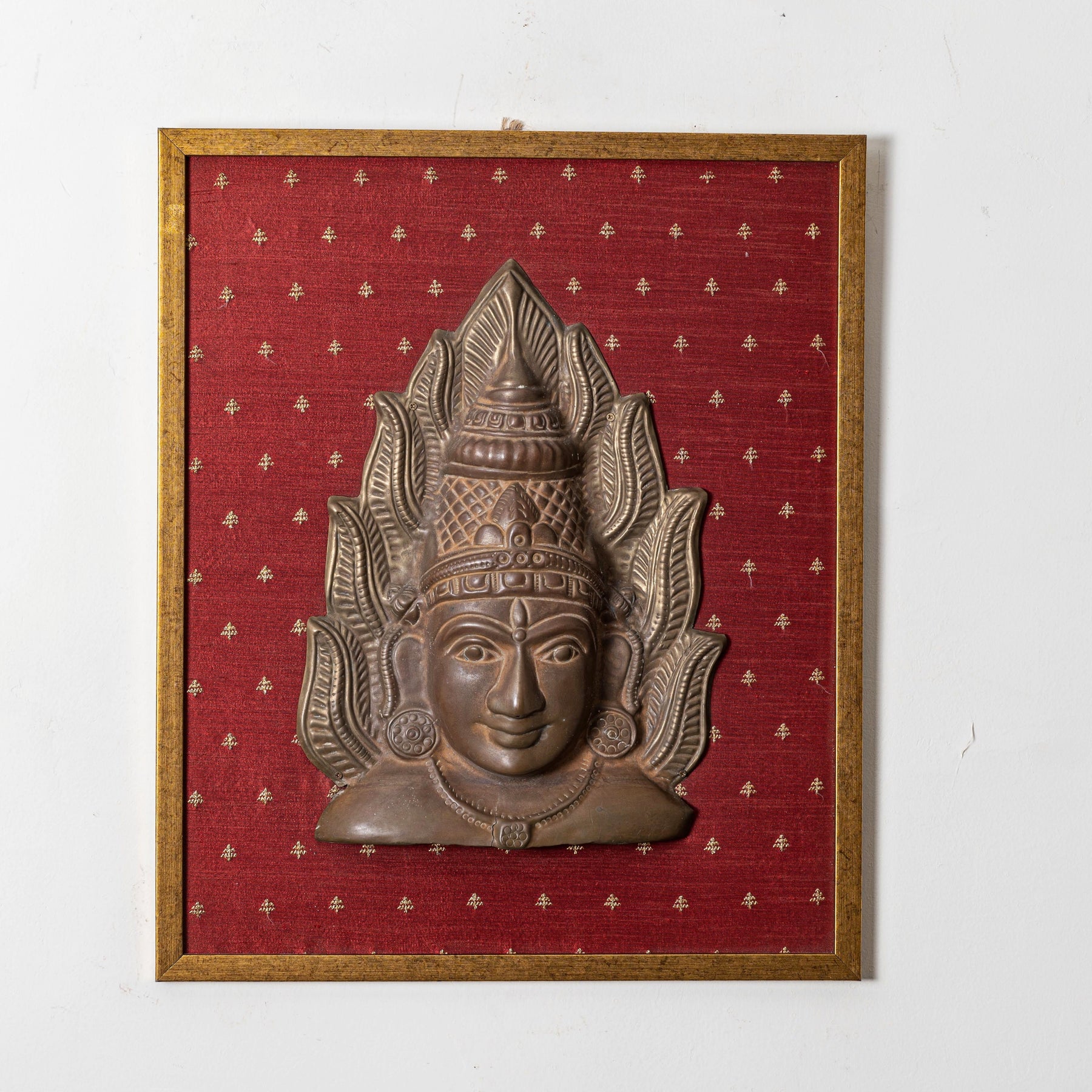 Vintage Mask of Goddess Amman framed on embroidered silk