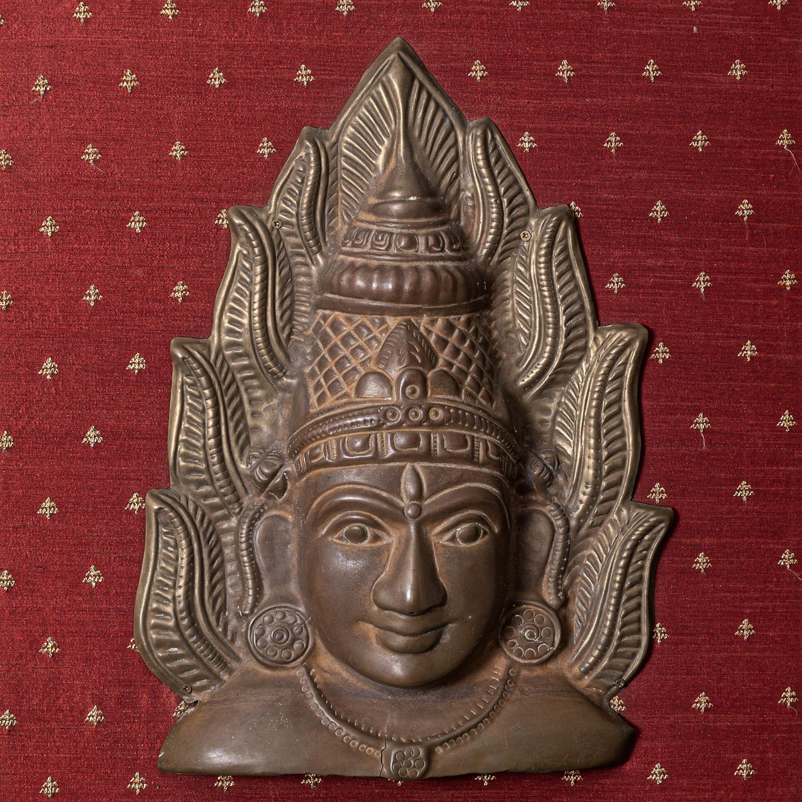This stunning work from the framed masterpiece collection is an exquisite vintage mask of Goddess Amman framed on embroidered maroon silk. The copper mask is a finely executed piece made by repoussing technique. The details of the piece are brought out very succinctly by the artist, a great example of the intricate Indian craftsmanship of the past. The mask is over 60 years old and set contrastingly against a beautiful maroon silk cloth. An ideal piece for collectors.
